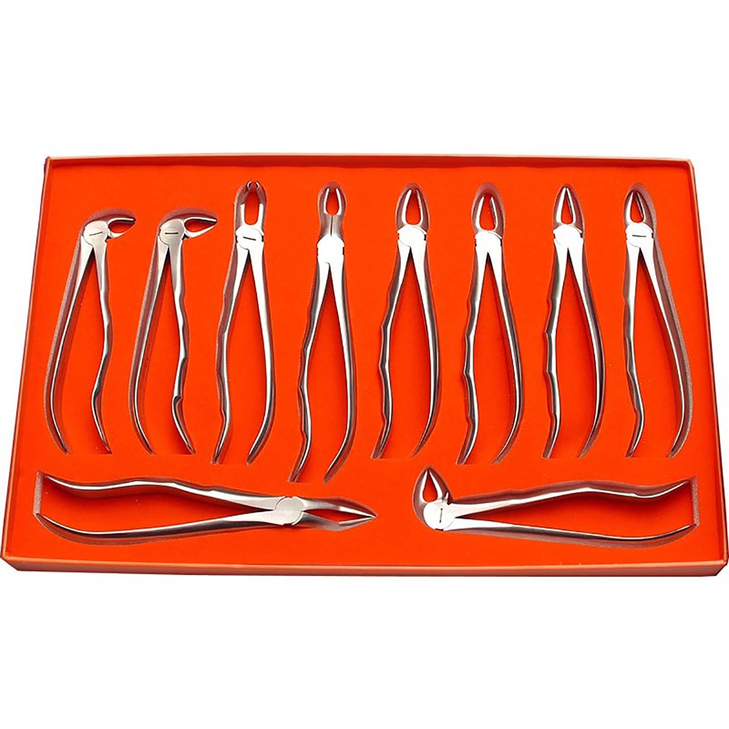 Set of 10 forceps with ergonomic handle.